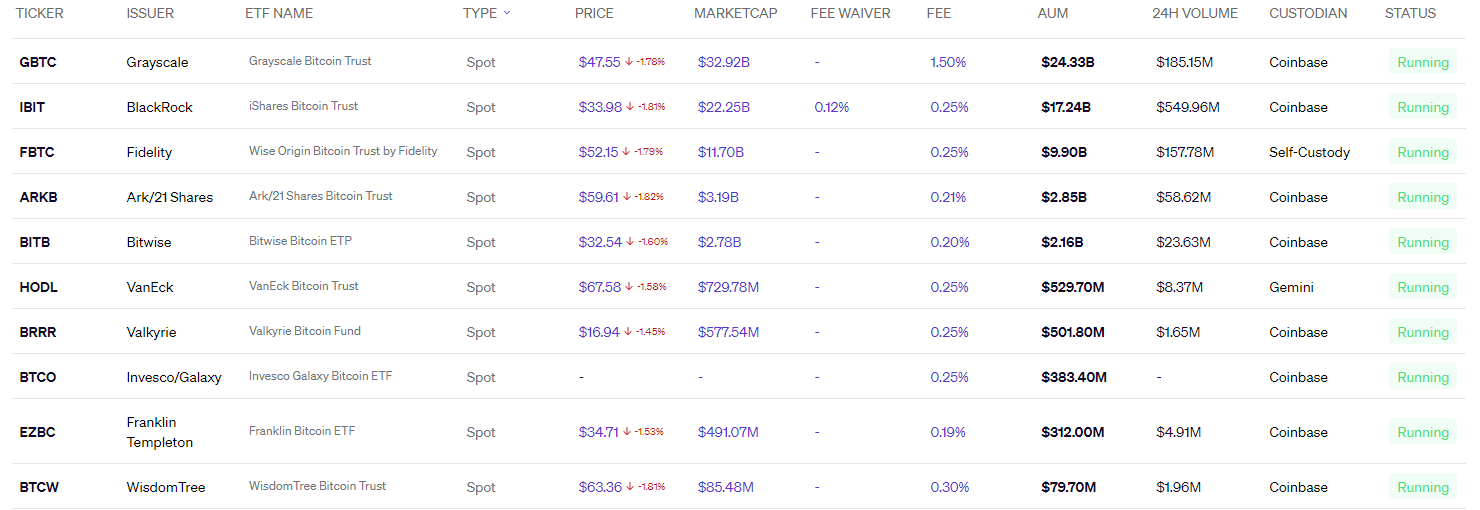 Ešte v minulom roku ste nevedeli zarábať na cenových pohyboch Bitcoinu bez nutnosti platenia daní. Avšak všetko sa zmenilo s príchodom spotových ETF. Dnes už totiž viete nakúpiť akcie fondu, ktorý vlastní Bitcoiny, a vďaka tomu nepriamo investovať do Bitcoinu. Síce v takomto prípade nie ste majiteľ kryptomeny, no držíte aktívum, ktoré sa naň viaže. Zoznam spotových ETF podľa údajov Blockworks nájdete na tomto obrázku.