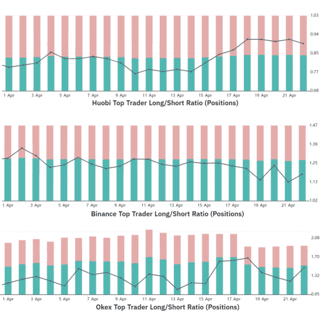 Podobný trend sa vyskytol aj na burze Binance, kde čistý obchodný pomer long-to-short ratio obchodníkov dosiahol najvyššiu hodnotu 17. apríla. Aj keď mierne uprednostňujú longy, súčasný ukazovateľ 1,18 sa nachádza v dolnom rozmedzí posledných troch týždňov. Investorom sa momentálne odporúča, aby počkali na ukončenie piatkových opcií.