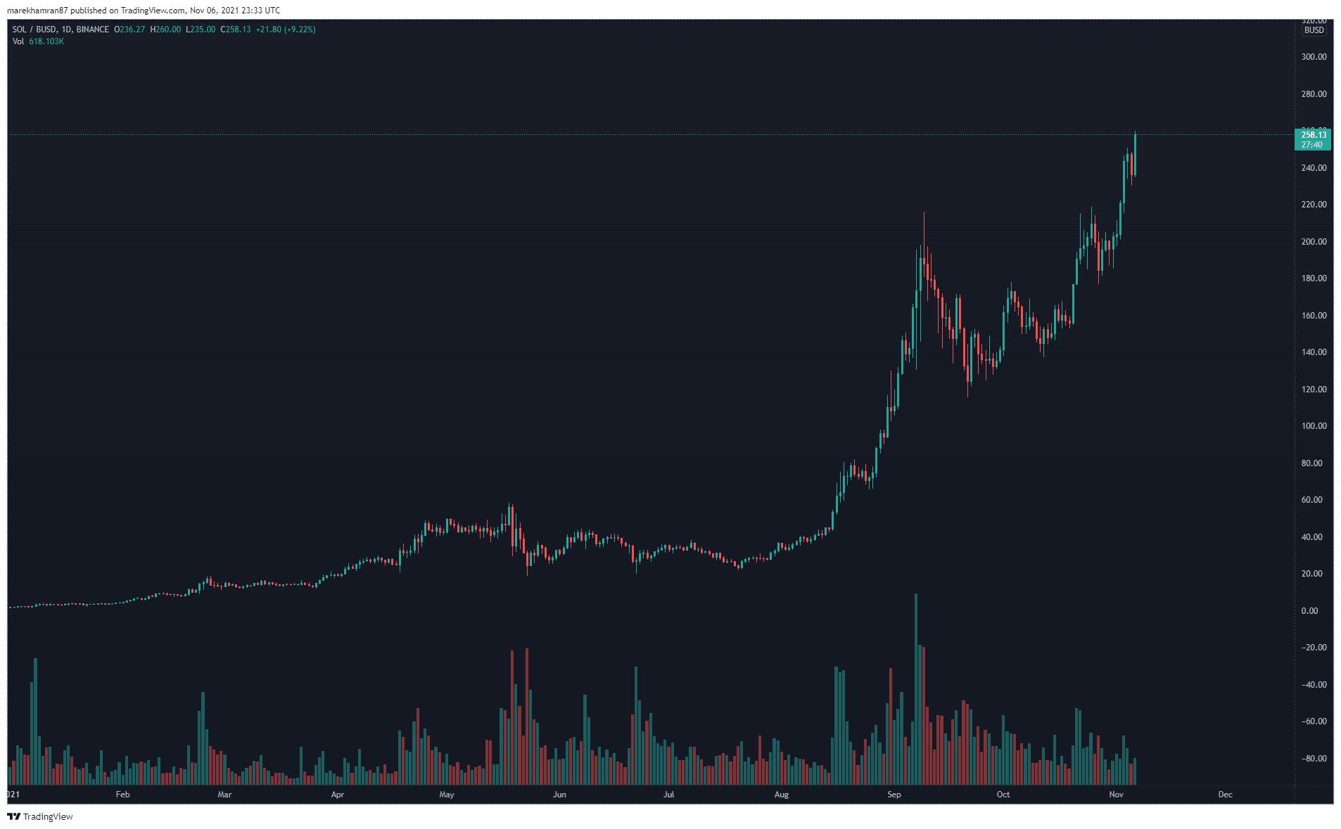 Solana patrí medzi najvýkonnejšie siete, a preto môžeme v ďalšom období očakávať vývoj. V čase písania tohto článku sa token SOL obchodoval na úrovni 257,92 USD. Za posledný týždeň dosiahol tento významný projekt nárast až o 35 %.
