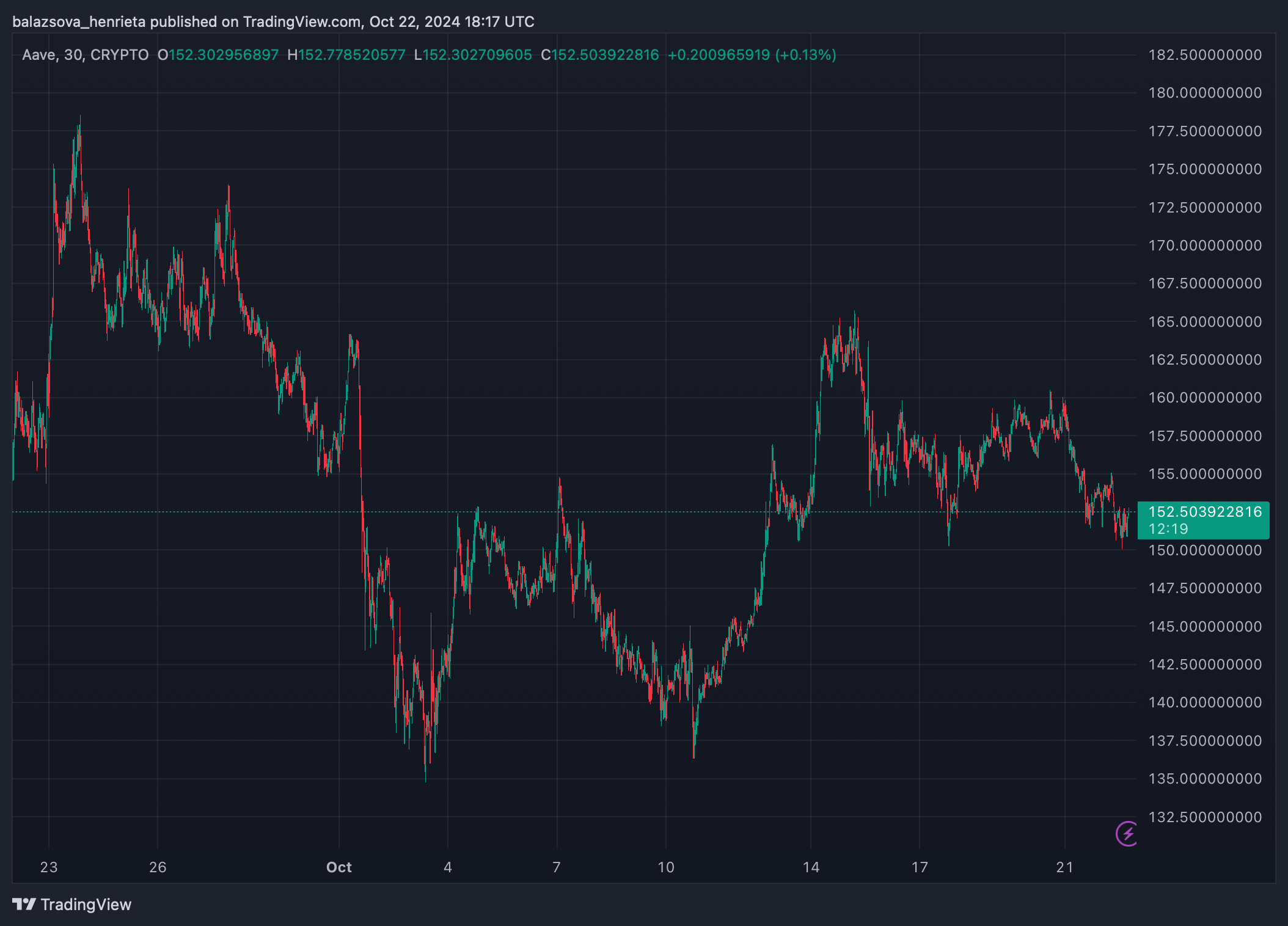 Aave sa v súčasnosti obchoduje medzi 150,78 a 166,24 dolára, pričom za posledný týždeň (-0,47 %) a mesiac (0,48 %) vykazuje malé zmeny. 10-dňový a 100-dňový jednoduchý kĺzavý priemer sú blízko seba, na úrovni 156,23 a 156,60 dolára, čo naznačuje stabilný pohyb.