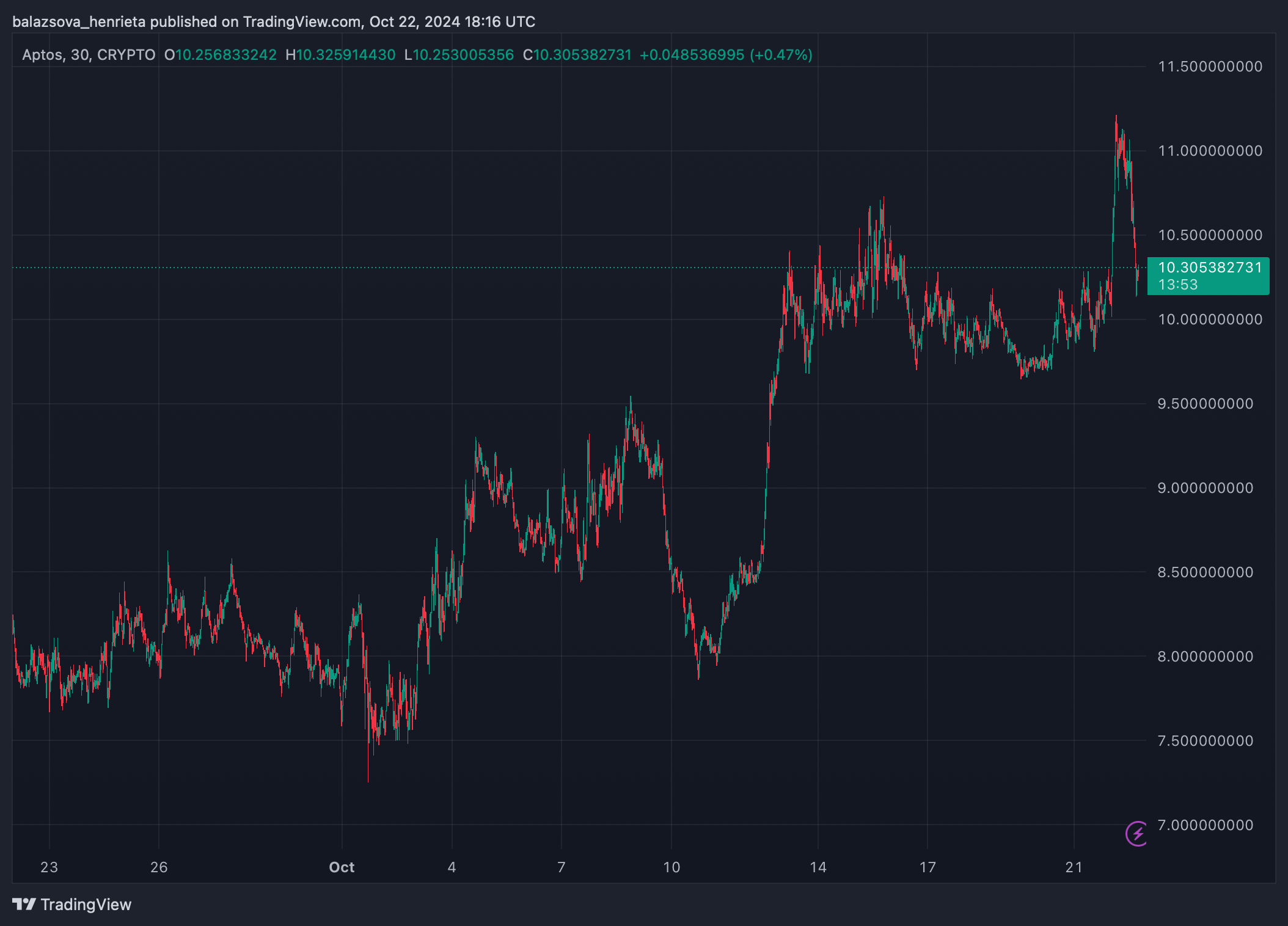 Aptos (APT) sa obchoduje medzi 9,50 a 10,60 dolára. Za posledný mesiac vykazuje silný výkon so ziskom 37,97 %. Minca sa blíži k najbližšej úrovni odporu 11,21 dolára. Ak túto úroveň prelomí, mohla by vystúpiť na druhý odpor na úrovni 12,31 dolára, čo by predstavovalo významný nárast oproti súčasným cenám.