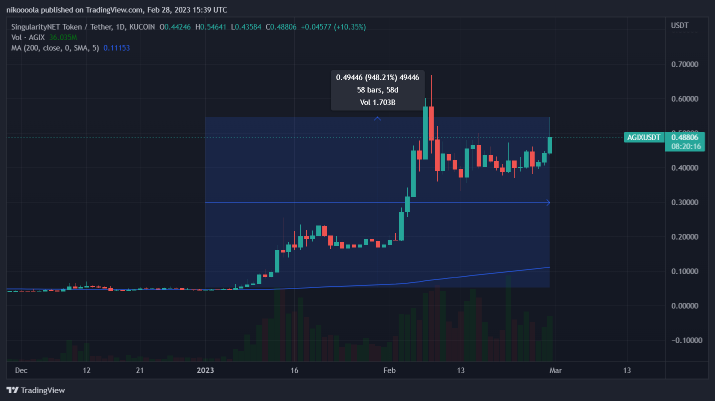 AGIX je token, ktorým je možné platiť na trhovisku SingularityNET za rôzne služby umelej inteligencie. O extrémnom raste ceny, ktorý táto kryptomena zaznamenala v tomto roku, sme informovali začiatkom februára. Dnes je cena AGIX takmer o 1000 % vyššia ako na konci roka 2022. Zobrazuje to nasledujúci denný graf tejto prudko rastúcej kryptomeny AI sektora.
