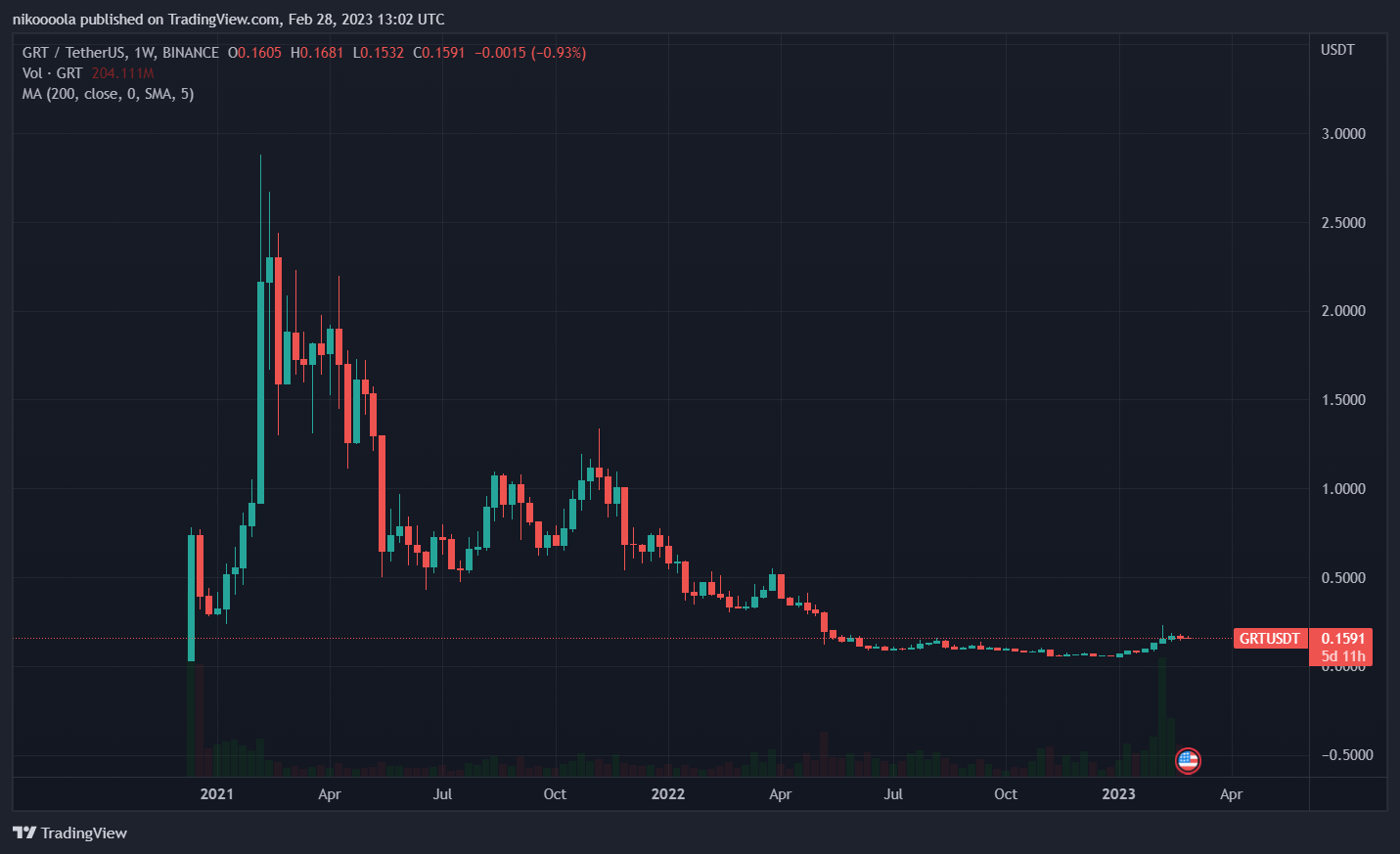 Najúspešnejším AI projektom je aktuálne The Graph. Jeho cena sa v čase písania článku pohybuje okolo 0,16 dolárov. Keď si uvedomíme v akej fáze trhového cyklu sa momentálne nachádzame a aký potenciál má projekt indexovacieho protokolu blockchainu, môžeme zvážiť možné zhodnotenie investície do tohto digitálneho aktíva. Na nasledujúcom týždennom grafe môžete vidieť, ako extrémne sa súčasná cena vzdialila od maximálnej dosiahnutej ceny tokenu GRT. Otázkou je, či GRT opäť dosiahne svoju historický najvyššiu hodnotu alebo ju dokonca prekoná.
