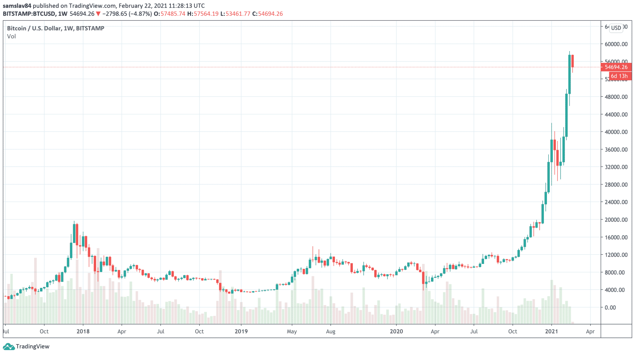 Bitcoin vytvoril tri rekordne vysoké zelené weekly sviečky (ďakovať za ne môžeme Elonovi Muskovi a jeho Tesle). Po tak silných týždňoch, ktoré navyše sprevádzala najsilnejšia altcoinová sezóna od roku 2018, je naozaj namieste ďalšia korekcia. Ako hlboko v nej zájdeme? Ťažko povedať. No tá posledná z januára 2021 trvala ti týždne a Bitcoin v nej klesol o necelých 30%. V porovnaní s korekciami z roku 2017 to bolo dosť slabé.