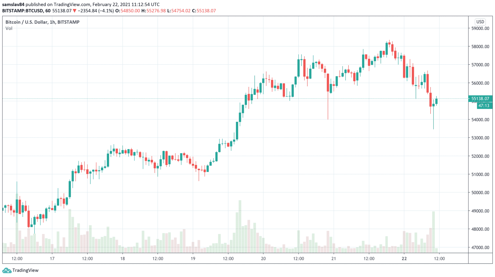 Trh s kryptomenami včera večer zaznamenal celkom slušnú korekciu. Po tom, čo Bitcoin dosiahol nové historické maximum na cene 58 339 $ (Bitstamp) v priebehu štrnástich hodín klesol o viac než 4500 $. Odrazil sa až pred hodinou na cene 54 466 USD. Posledná hodinová svieca má vysoký tieň, čo naznačuje, že iniciatívu aspoň nateraz prevzali býci.