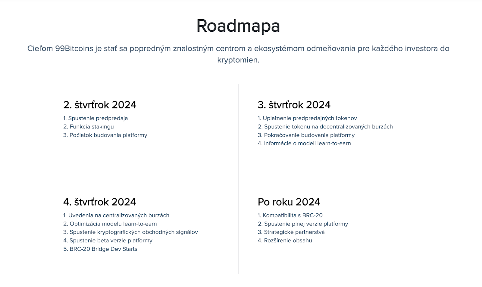 Roadmapa 99Bitcoins. Zdroj: presale.99bitcoins.com/sk