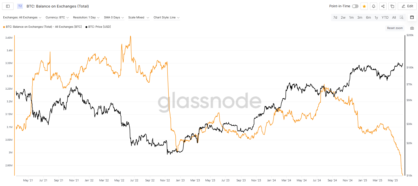 Kľúčovým faktorom môže byť aj pohyb mincí mimo búrz. Podľa príspevku analytika BaykusCharts pre CryptoQuant z 10. júna klesli bitcoinové rezervy na centralizovaných burzách z 1,55 milióna v júli 2024 na iba 1,01 milióna BTC. Ide o pokles o 550 000 BTC, čo poukazuje na trend dlhodobého držania a znižovania dostupnej ponuky.