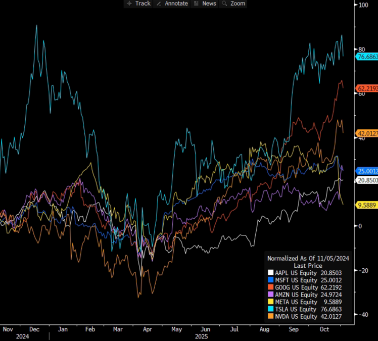 Zhodnotenie akcií Magnificent 7 za posledný rok je vidieť na nižšie uvedenom grafe. Bez započítania dividend sa zhodnotenie akcií pohybuje v rozmedzí od 10 % do 77 %. Tomáš Vranka, Jarda Brychta a Marek Nemky sa v najnovšej epizóde Povídání o trzích od spoločnosti XTB venovali výsledkom týchto veľkých technologických spoločností.