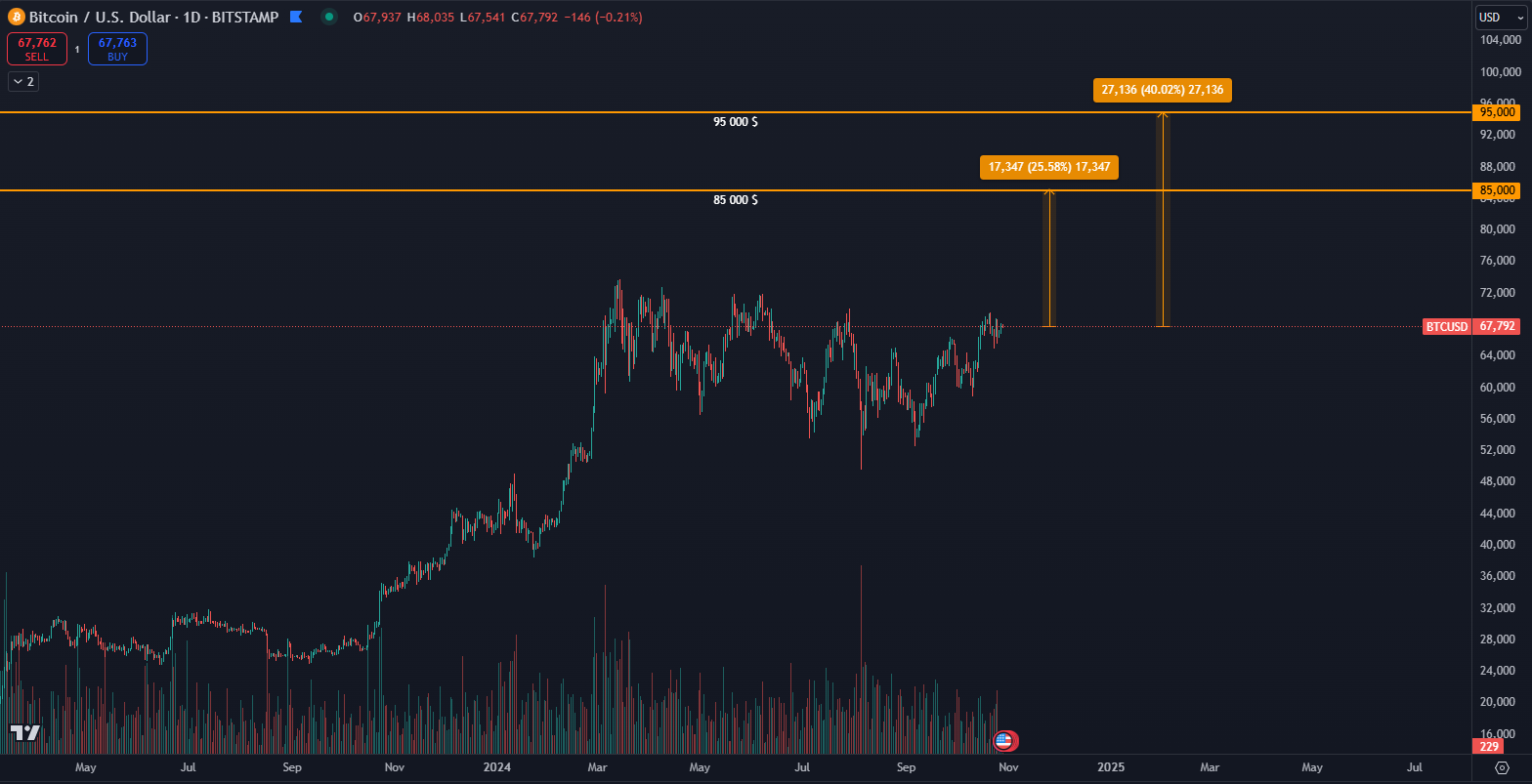 Na základe technickej analýzy a uvedených faktorov AI predpokladá, že Bitcoin má potenciál dosiahnuť do konca roka 2024 hodnotu v rozmedzí 85 000 až 95 000 dolárov. Táto predpoveď zohľadňuje nielen historický vplyv halvingu, ale aj rastúcu adopciu medzi inštitucionálnymi investormi a globálnu ekonomickú situáciu.