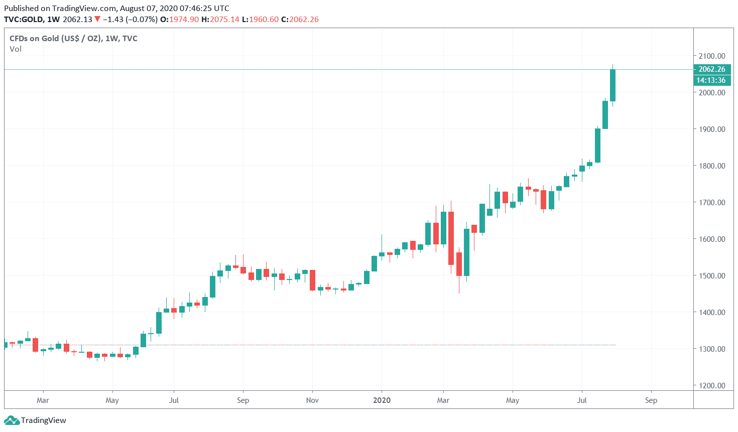 Aj napriek tejto nepríjemnej situácii však hodnota akcií amerických firiem rastie. Teda… ak ju budeme denominovať v dolároch. Ak by sme ju však porovnali so zlatom, razom všetko vyzerá inak. Hodnota tohto vzácneho kovu nedávno prekonala historické maximum, minulý víkend prerazila 2000 $ a aktuálne sa už obchoduje za viac než 2060 $.