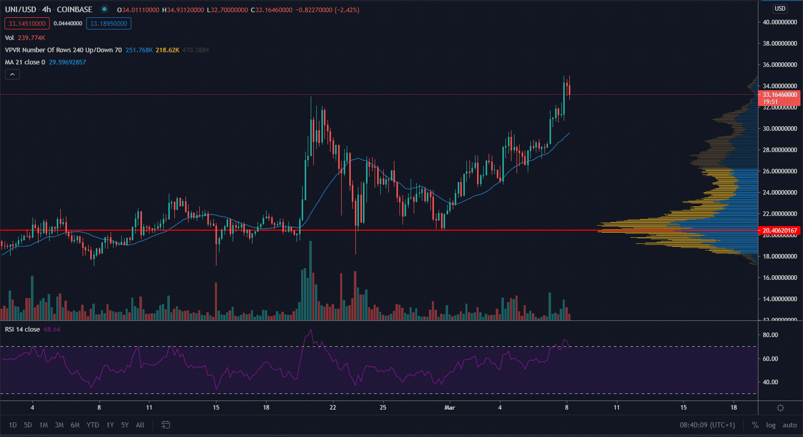 Messari v súčasnosti zaraďuje UNI ako druhé najväčšie aktívum založené na étere, čím porazil spoločnosť Chainlink o takmer 50% svojou kapitalizáciou. UNI sa 5. marca prebojoval do top 10 a stal sa prvým tokenom DeFi DApp, ktorý to dosiahol. Cena UNI sa v súčasnosti pohybuje na hladine okolo 33,00$.