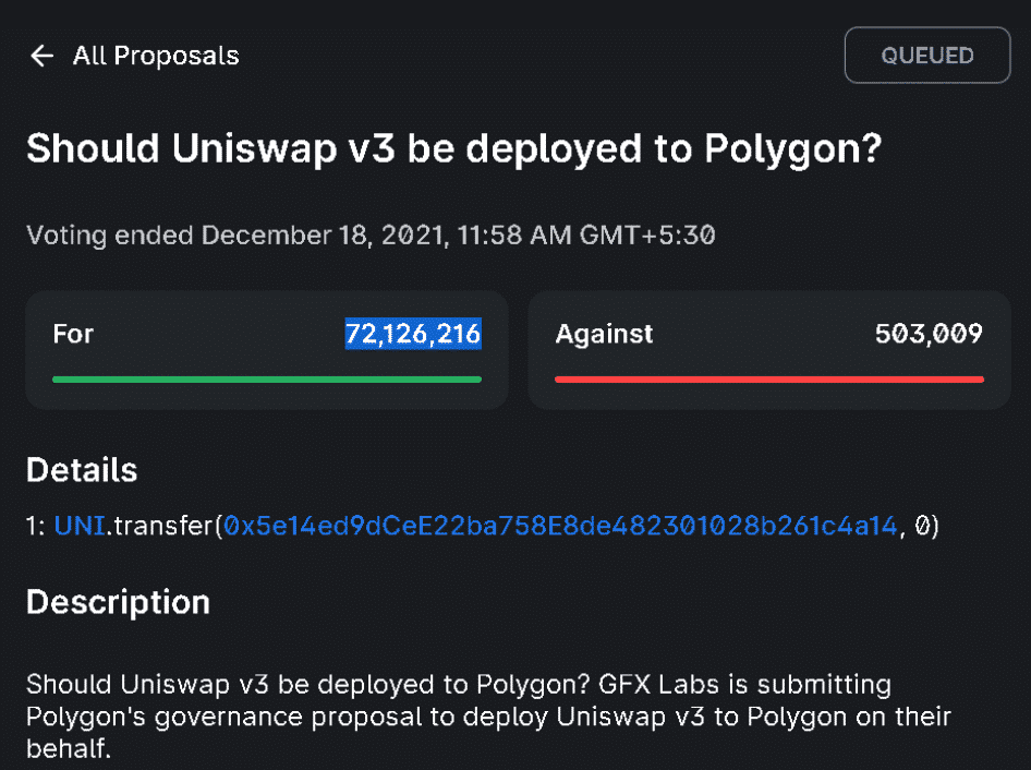Komunita Uniswapu schválila návrh správy, ktorý sa snažil nasadiť zmluvy Uniswap v3 cez reťazec Polygon PoS. Schválenie prichádza vo forme hlasovania v reťazci, na ktorom sa zúčastnilo viac ako 72,6 miliónov používateľov z komunity.