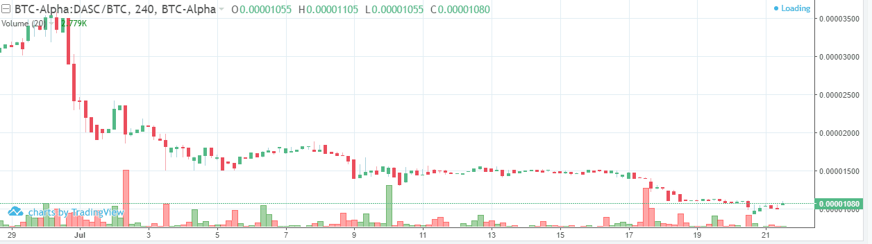 DasCoin napriek minimálnemu Volume, ktoré vo svojom maxime dosahovalo 650 000 $ a v súčasnosti sa pohybuje okolo 20-80 000 $, dlhodobo klesá. Od zalistovania na burzy stúpol z hodnoty 17c na 20c, momentálne sa pohybuje v okolí ôsmich centov a stále padá.