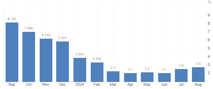 Keďže je Slovensko súčasťou eurozóny, sťahujú sa na nás rovnaké úrokové sadzby, aké určuje ECB. To ale nemôžeme tvrdiť aj o inflácii. Ročná miera inflácie na Slovensku sa v auguste 2024 zvýšila na 2,8 %, čo je nárast z 2,6 % v predchádzajúcom mesiaci, ale mierne pod očakávaniami trhu vo výške 2,9 %.