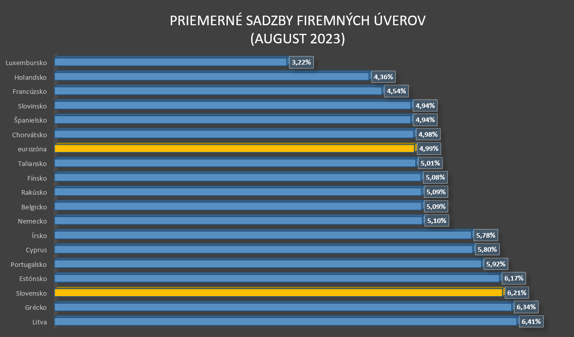Slovenské firmy si za mesiac august požičiavali od bánk za priemerný úrok 6,21 %. Drahšie je už len Grécko (6,34 %) a Litva (6,41 %), zatiaľ čo priemer eurozóny je na úrovni 4,99 %. Najlacnejšie si firmy požičiavajú v Luxembursku (3,22 %). Veľa podnikateľov spláca ešte úvery spred pandémie koronavírusu za nižšie úroky, no čoskoro ich čaká zásadný rast nákladov, čo potlačí firemné investície.