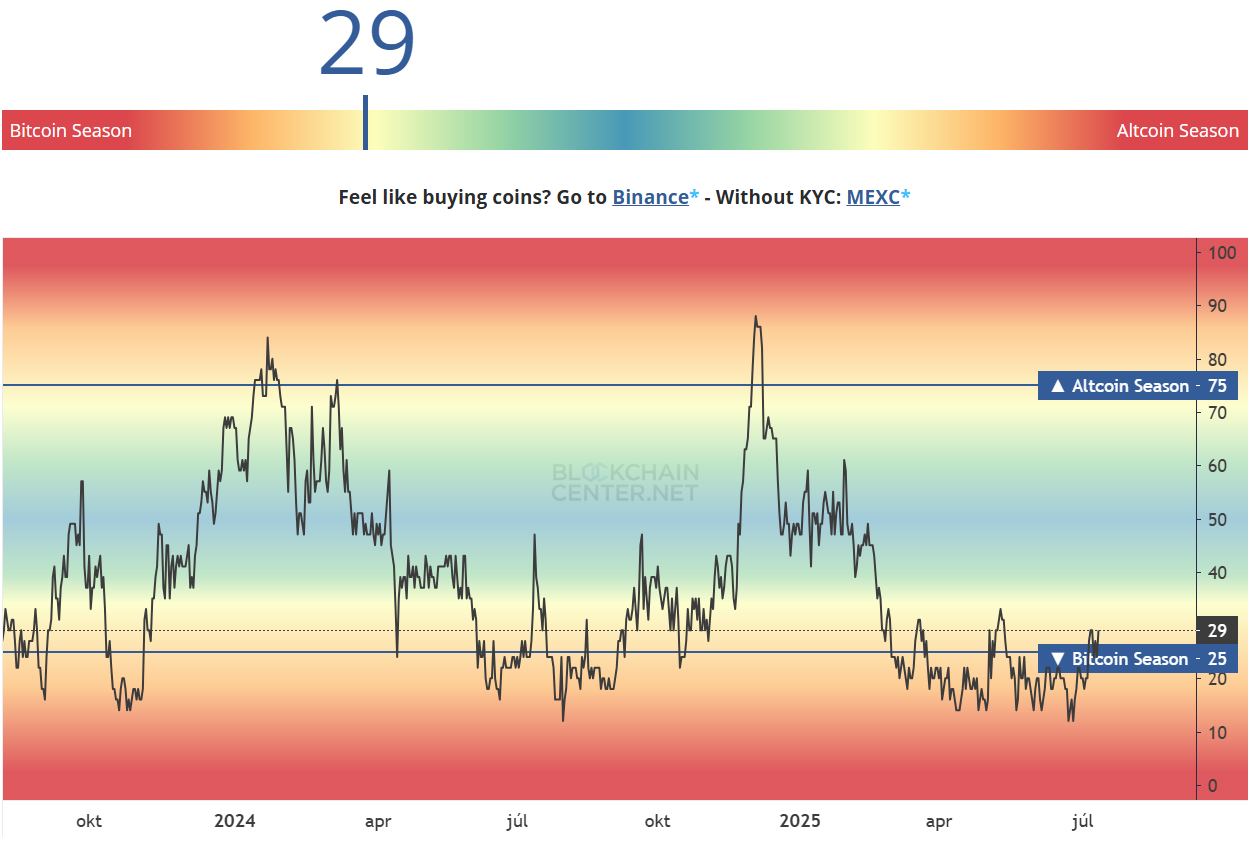 Ak 75 % z Top 50 mincí (bez stablecoinov) prekoná Bitcoin za 90 dní, ide o altcoinovú sezónu. Tento index však zatiaľ stále signalizuje dominanciu Bitcoinu, čo znamená, že nie všetky ukazovatele sú zhodné s krátkodobými trendmi. Aj keď viaceré altcoiny aktuálne prekonávajú Bitcoin, pravá altcoinová sezóna ešte nezačala – chýba dlhodobý rast altcoinov a nestačí iba krátkodobý.