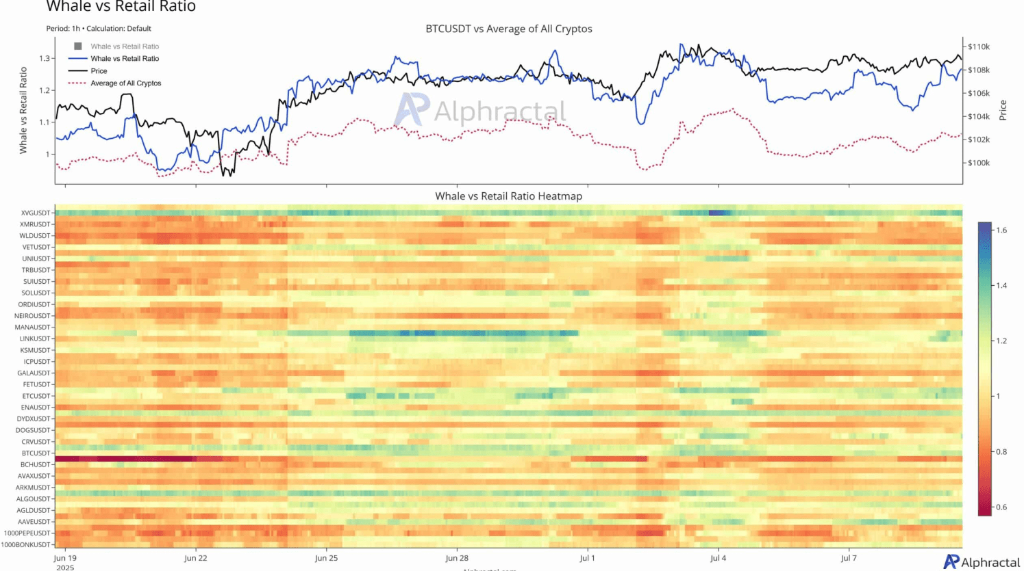 Ďalší dôležitý signál potvrdzujúci altcoinovú sezónu je nárast aktivity veľkých investorov, teda veľkých investorov. Pomocou indikátora „Whale vs Retail Ratio”, ktorý sa od konca júna drží nad hodnotou 1,1, sa dá usudzovať, že práve veľkí hráči intenzívne nakupujú altcoiny, zatiaľ čo retailoví investori zostávajú opatrní.