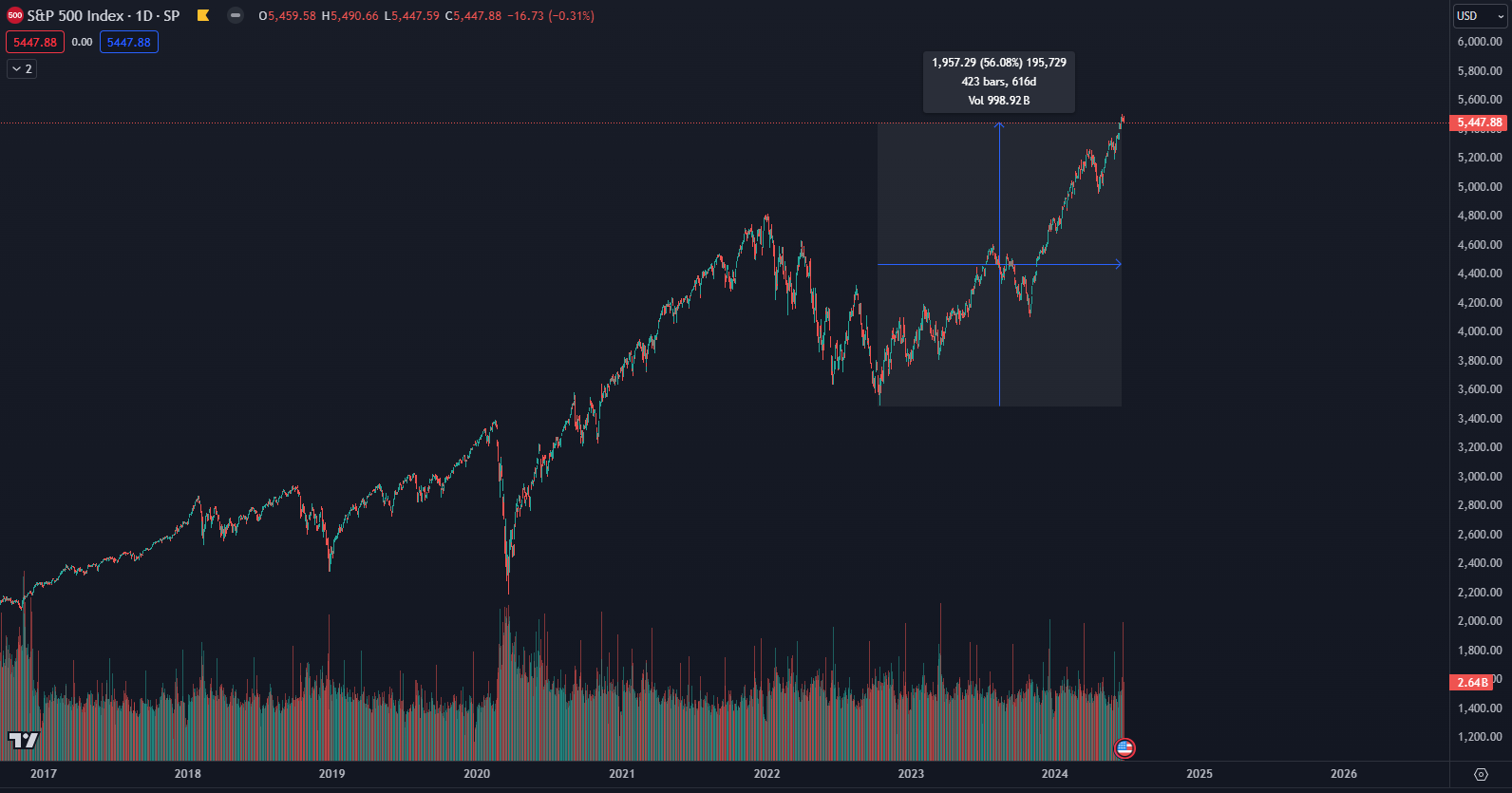 Najväčší a najznámejší akciový index S&P 500 sa od októbra 2022 zhodnotil až o 56 %. Na pomery akciového trhu je to pozoruhodné číslo. Len aby ste mali predstavu, dlhodobý priemerný ročný výnos je 8 až 10 %. Hlavným dôvodom prudkého nárastu sú technologické firmy, ktoré cítia extrémny dopyt po umelej inteligencii.