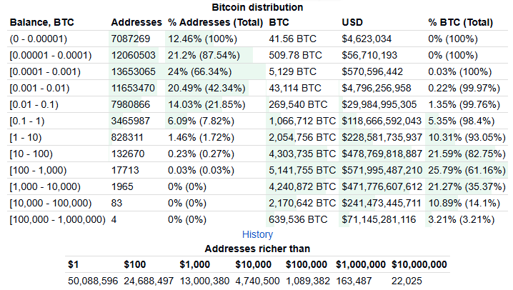 Rozdelenie BTC peňaženiek podľa počtu mincí. Zdroj: bitinfocharts.com