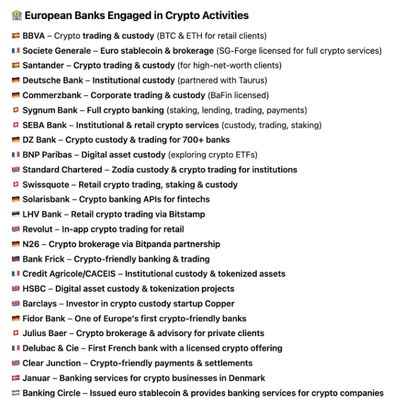While the U.S. OCC just issued guidance allowing banks to engage in crypto services such as custody or stablecoin services, European banks are already years ahead.