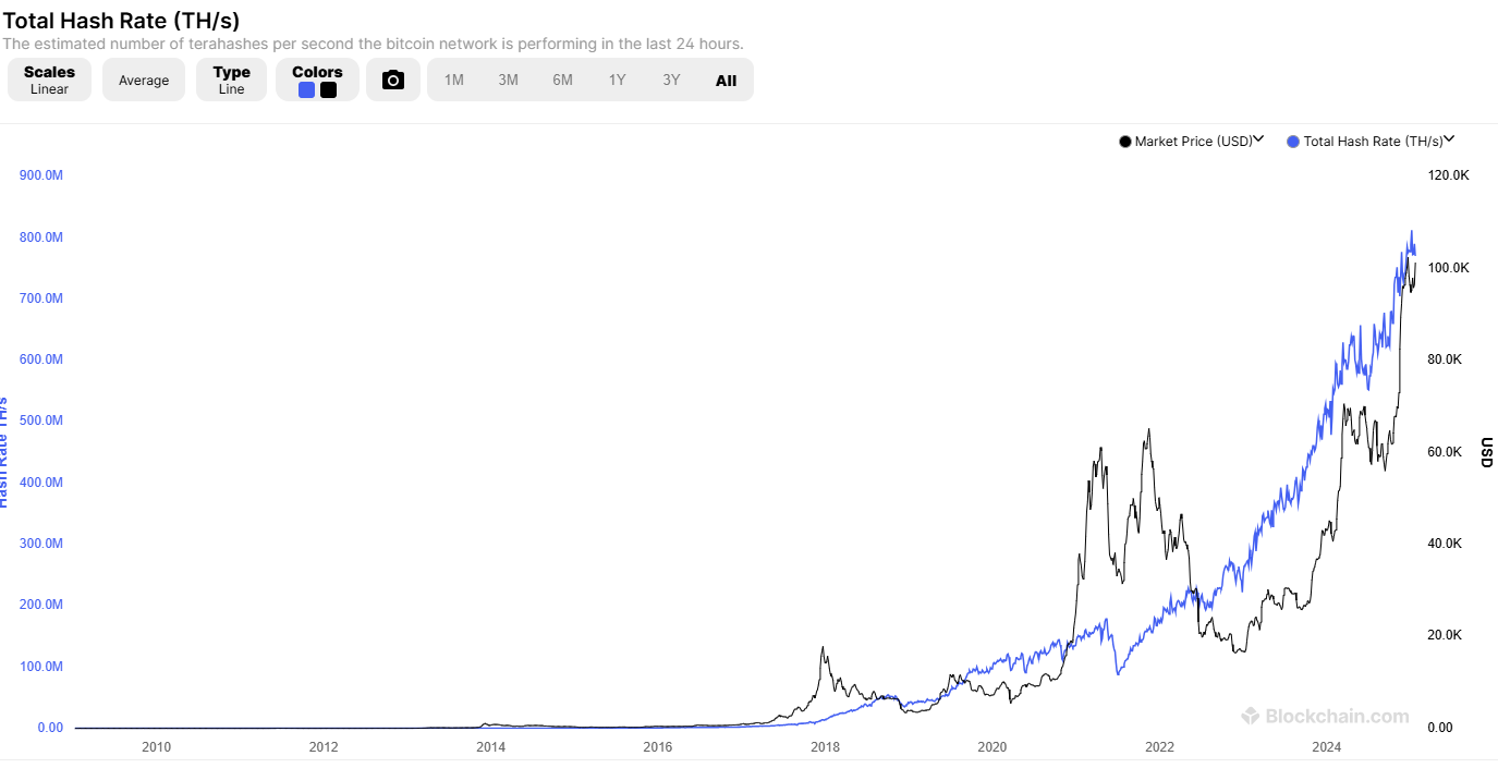 Hashrate Bitcoinu od roku 2010. Zdroj: Blockchain.com