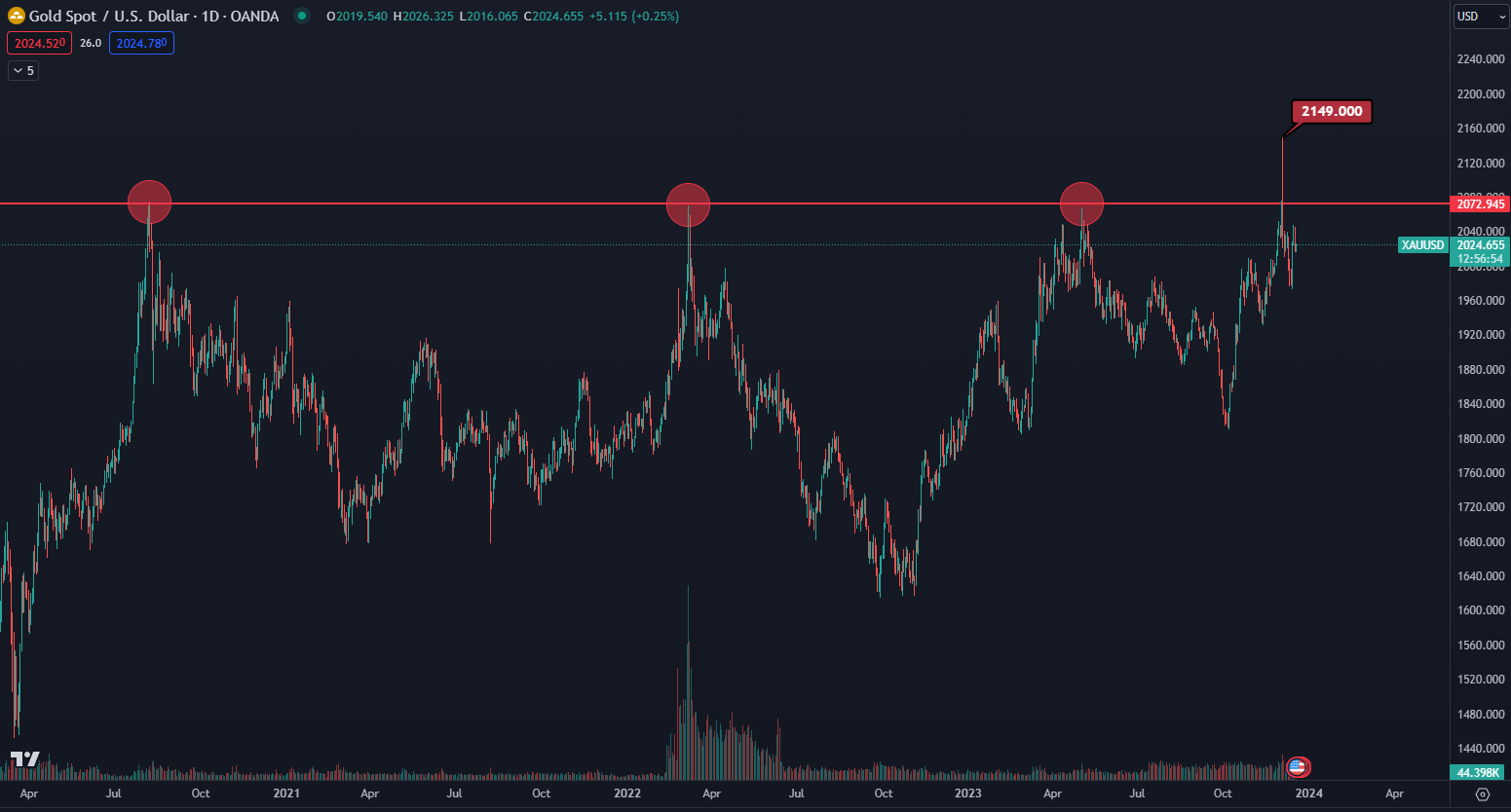 Cenový cieľ 3 000 dolárov sa nezdá až taký nereálny, keďže zlato nedávno prekonalo historické maximum. Dňa 4. decembra sme boli svedkami doteraz najvyššej ceny zlata na úrovni 2 149 dolárov. Aj keď prerazenie rezistencie bolo iba krátkodobé, napriek tomu sa na istý čas cena vyšplhala na nové doteraz nepoznané úrovne.