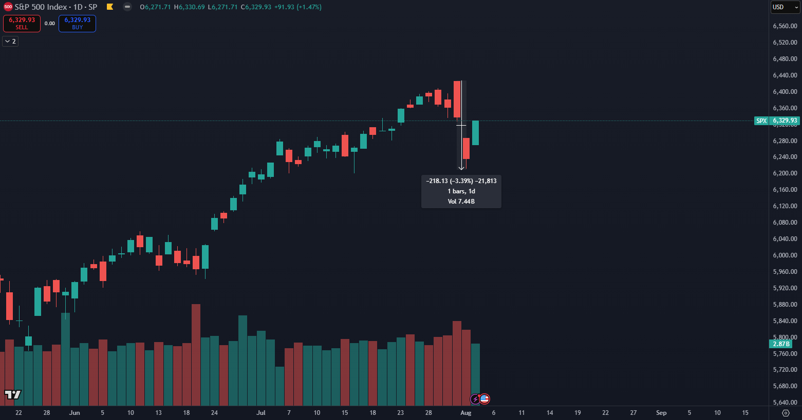 Začiatok augusta potvrdil tieto slová a trh zareagoval negatívne na slabé výsledky z trhu práce a nové clá zo strany americkej vlády. Index S&P 500 klesol o 3,40 % a uzavrel na hodnote 6 238 bodov, ukazujú údaje TradingView.
