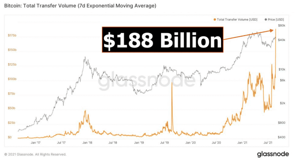 BTC opäť zlomil ďalší míľnik. Kryptomena zaznamenala exponenciálny nárast objemu pohybujúcich sa Bitcoinov v rámci jej siete. Sedemdňový kĺzavý priemer objemu Bitcoinu v sieti tentoraz prekonal rekord. Objem ukazuje, že včera bolo v rámci siete presunutých 188 miliárd dolárov. To znamená, že bolo presunutých približne 20 % trhovej kapitalizácie Bitcoinov.