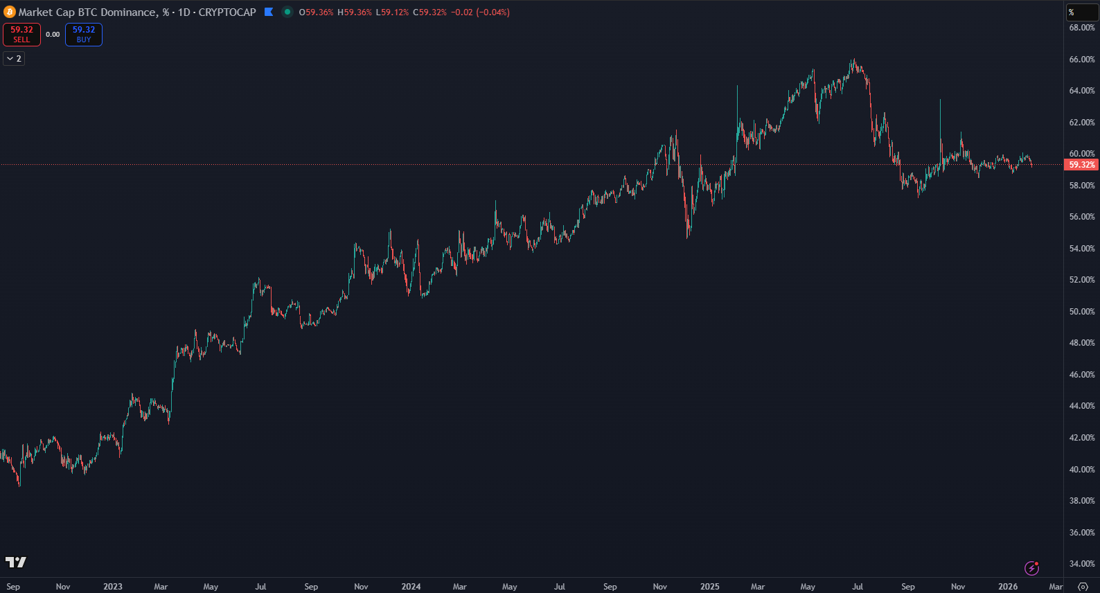 Bitcoin si naďalej udržiava vedúce postavenie na krypto trhoch s dominanciou okolo 59 %, ktorá predstavuje podiel BTC na celkovej trhovej kapitalizácii digitálnych aktív. Tento trend odráža pretrvávajúcu geopolitickú neistotu a obozretný prístup k riziku v prvom štvrťroku 2026.