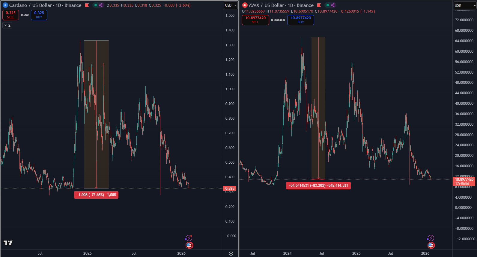 - Cardano kleslo o 76 % a Avalanche o 83 %, čo odráža katastrofálny stav trhu.