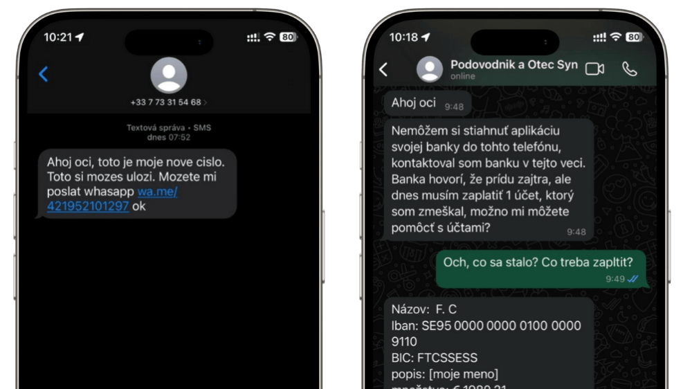 Scenár podvodu je dômyselne prepracovaný. Podvodník najprv pošle správu, v ktorej oznámi zmenu svojho telefónneho čísla. Následne presunie komunikáciu na WhatsApp alebo inú četovaciu aplikáciu. Tam začne rozprávať príbeh o pokazenom mobile či notebooku a súrne žiada o finančnú pomoc.