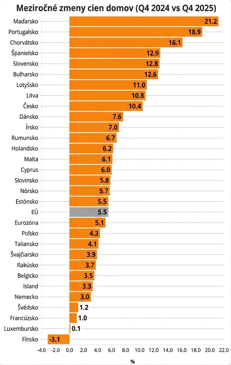 Najväčší medziročný nárast cien nehnuteľností zaznamenalo Maďarsko, kde ceny v štvrtom kvartáli 2025 stúpli o viac ako 21 %.