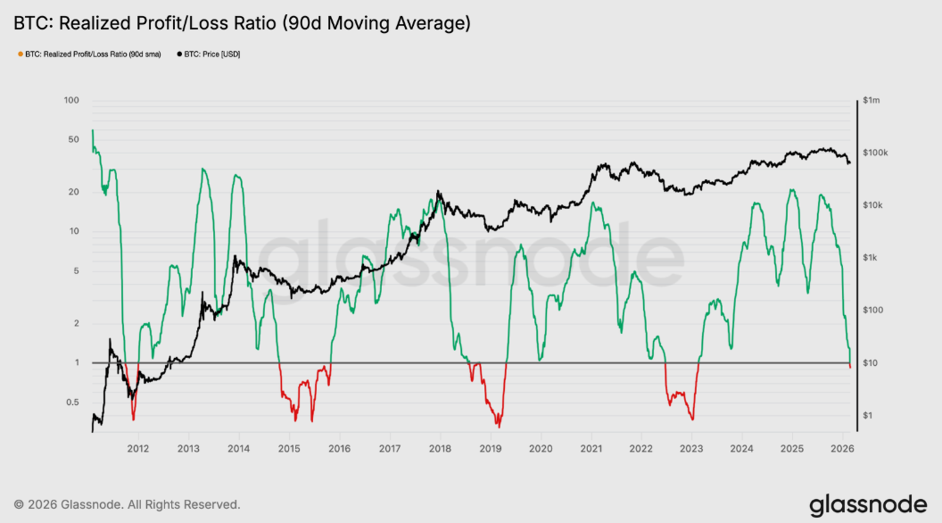 Slabú akumuláciu dopĺňa zhoršujúca sa likvidita. Kľúčový ukazovateľ, 90-dňový kĺzavý priemer pomeru realizovaného zisku a straty, klesol pod hodnotu 1. Táto hranica predstavuje zásadný bod obratu, pretože signalizuje, že investori realizujú viac strát než ziskov.
