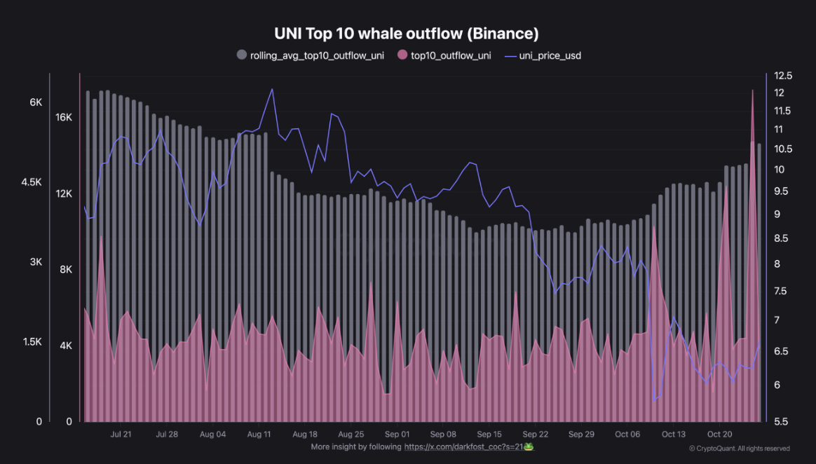 Tento vývoj prebieha v období nižšej aktivity v rámci celého DeFi sektora. No na horizonte sa objavuje zaujímavý signál. Veľkí investori na Binance začínajú znova nakupovať. Dáta od spoločnosti CryptoQuant odhalili nárast odlivov UNI tokenov z Binance, najmä v rámci desiatich najväčších transakcií.