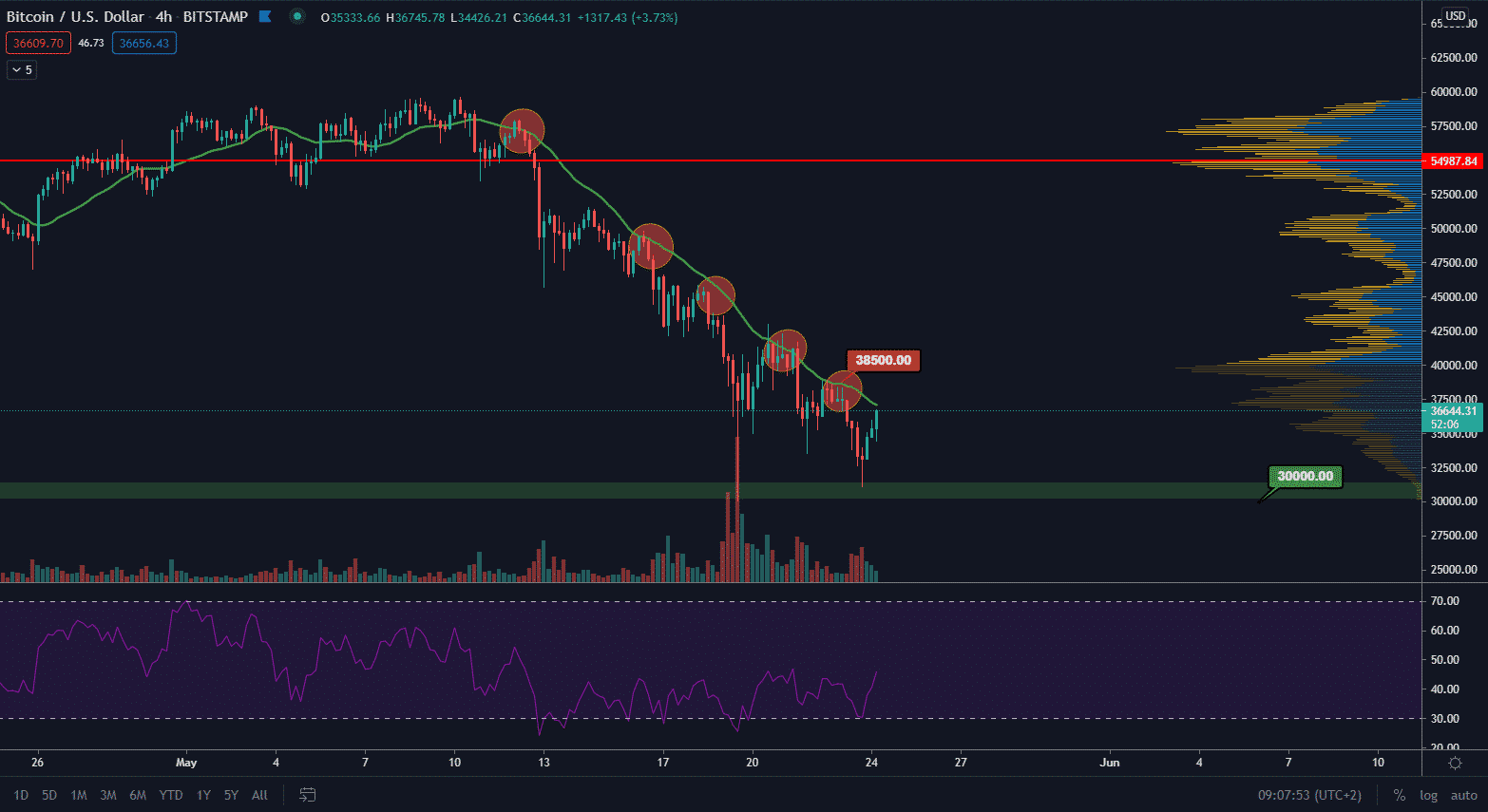 Cena Bitcoinu klesla v nedeľu pod 32 000 dolárov, pretože obchodníci pokračovali v hľadaní novej supportnej zóny. Najväčšia kryptomena má momentálne problém s prekonaním hodnoty MA21 na 4H perióde. Rezistencia sa nachádza na hladine 38 500$ a trhová cena znovu testuje tento odpor.