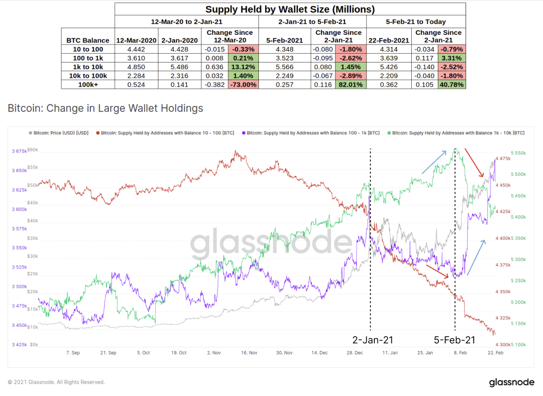 Glassnode definuje každú peňaženku s 1-10 tisíc Bitcoinami, ako veľrybu. Spoločnosť dávnejšie informovala, že veľryby začali v minulých mesiacoch hromadne skupovať BTC z trhu. V januári nakúpili viac než 80 000 BTC. Vo februári sa však tento trend otočil. Zatiaľ čo Bitcoin rástol, predali približne 140 000 BTC. Hodnota týchto mincí atakuje sedem miliárd dolárov. Počet veľrýb na trhu od začiatku roka stúpol o 14%.