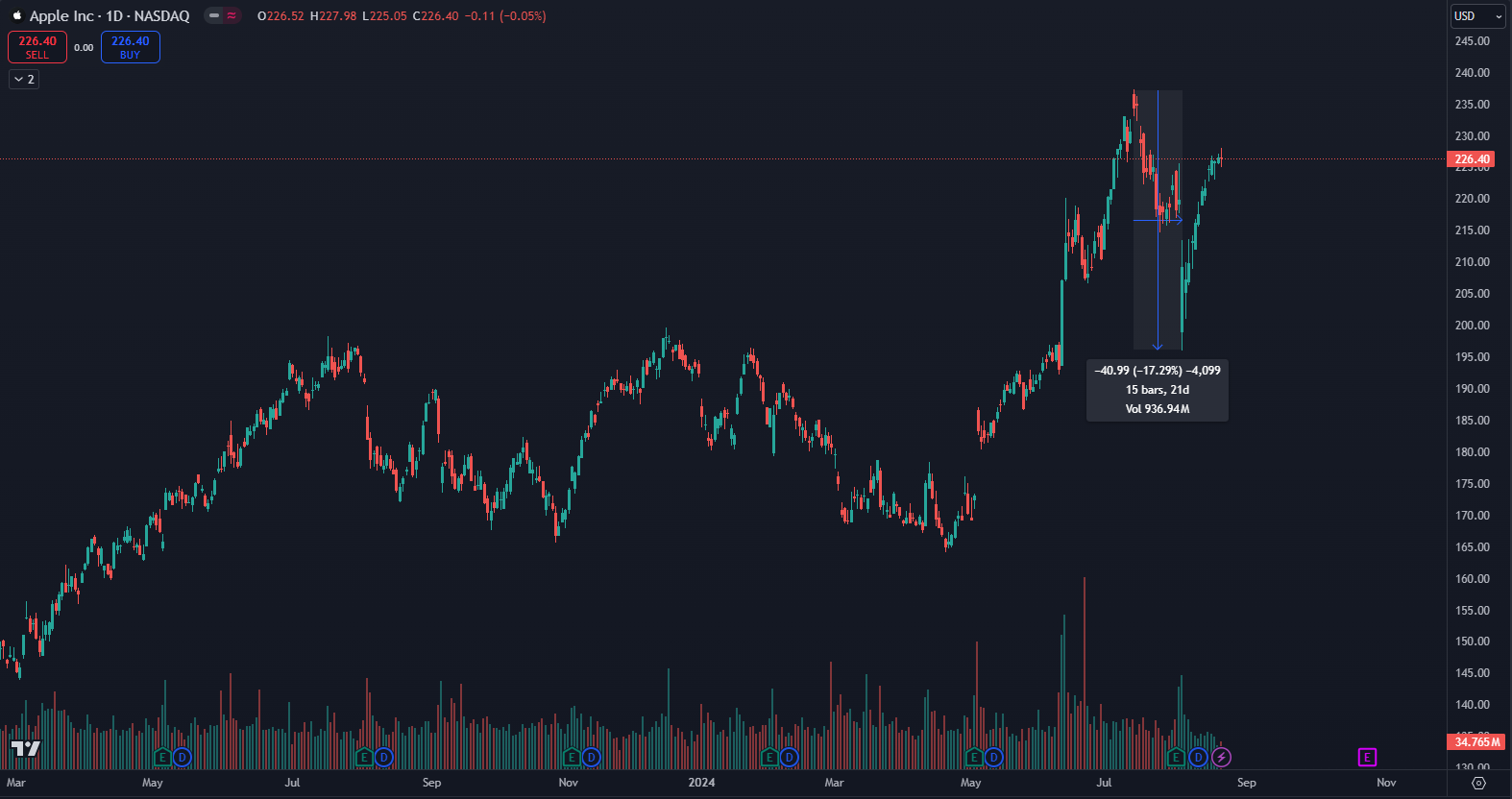 Apple je zároveň najväčšia akcia v populárnom akciovom indexe S&P 500 s celkovým podielom 6,93 %. Cenová výkonnosť sa preto značne podobá indexu. Nedávno sme boli svedkami masívneho prepadu, keď AAPL zleteli o 17 % len za 3 týždne, no zdá sa, že čoskoro opäť prekonajú historické maximum (ATH).