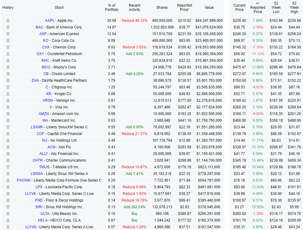 Okrem hlavnej zmeny v podobe predaja polovice akcií AAPL došlo v portfóliu aj k ďalším zmenám. Buffett sa zbavil aj 21,27 % akcií COF, 16,78 % akcií FND a 10,87 % akcií TMUS. Na druhej strane zvýšil držby akcií SIRI o 262,24 % a do portfólia pridal aj nové akcie ULTA a HEI.A.