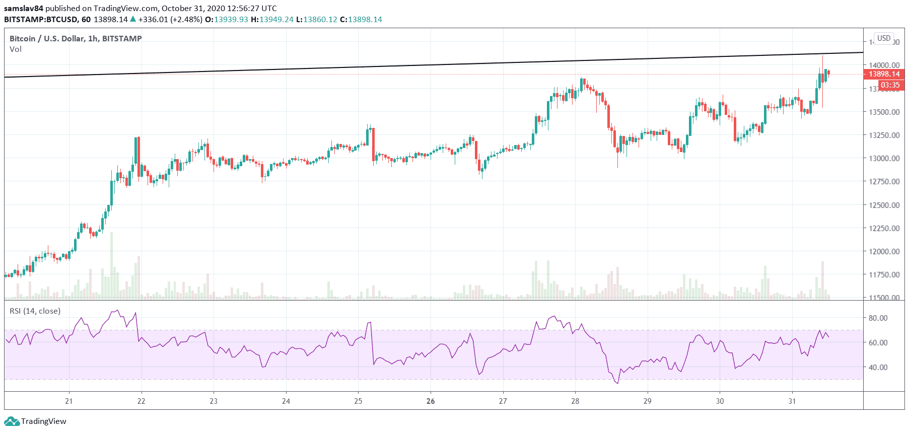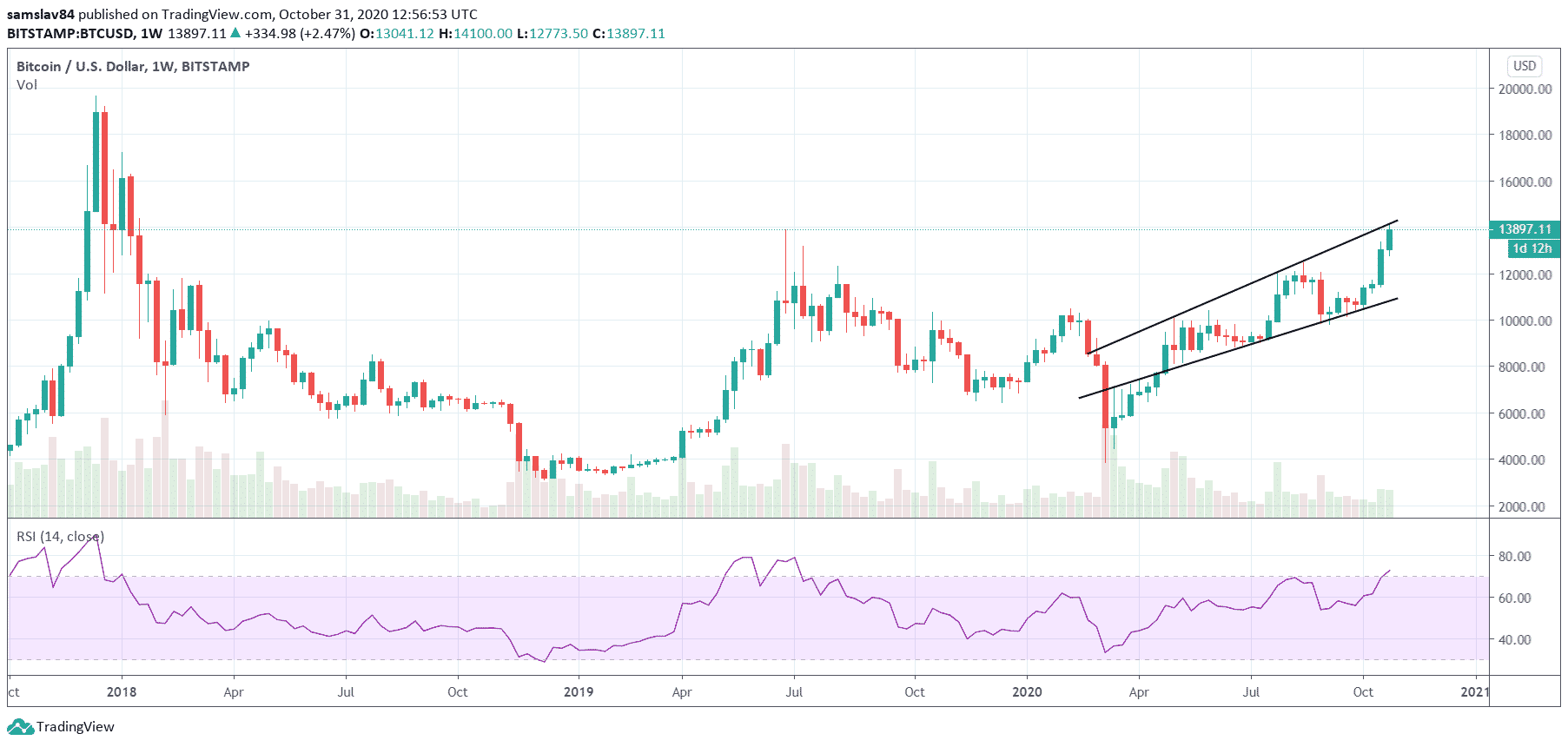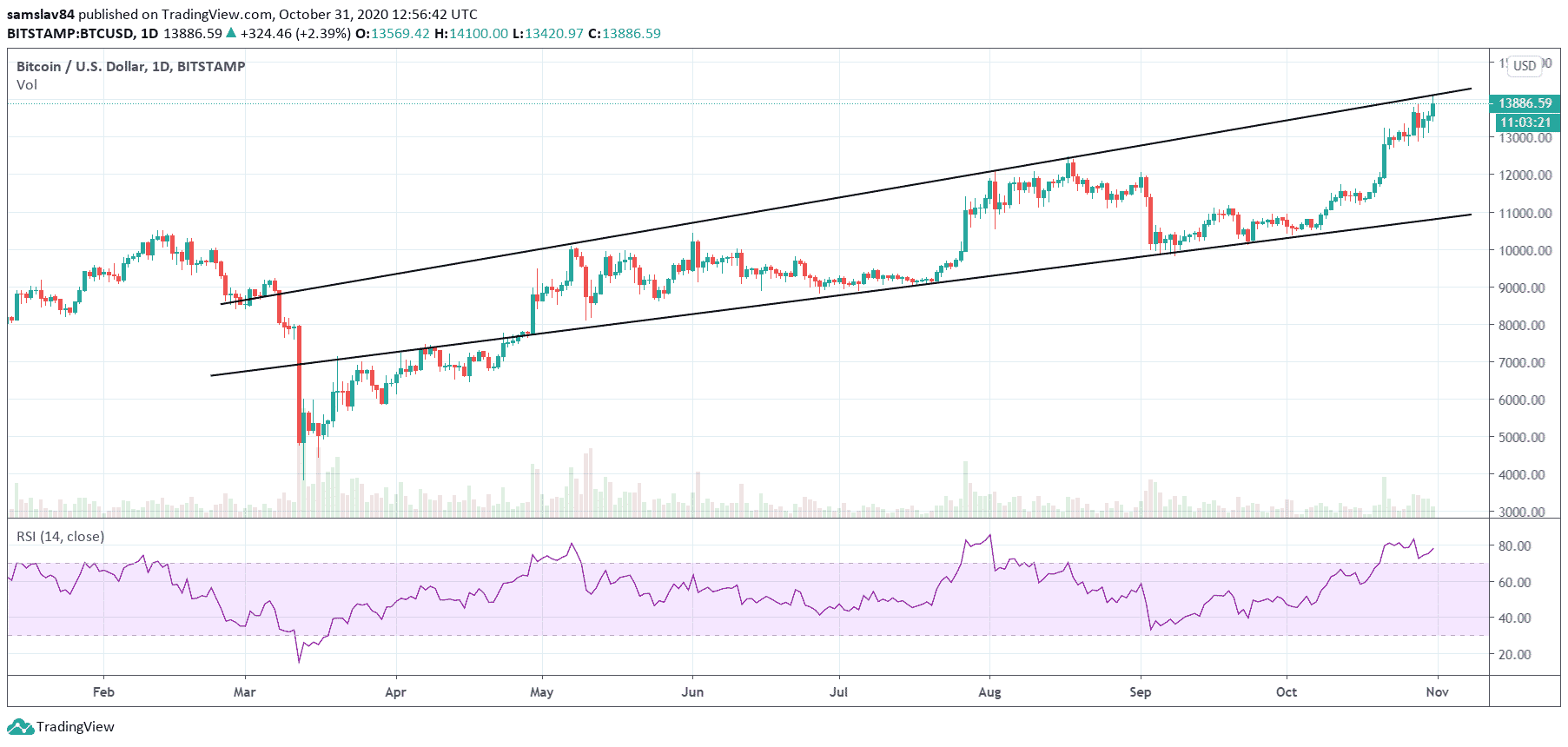 Za posledné týždne bolo toho rastu naozaj dosť. Počas októbra sa Bitcoin prebojoval z 10 500 $ až na súčasných (takmer) 14 000 $. Okolo obeda to dokonca bolo 14 100 $. Na tejto hodnote sa Bitcoin naposledy obchodoval v januári 2018 necelé štyri týždne po dosiahnutí historického maxima.