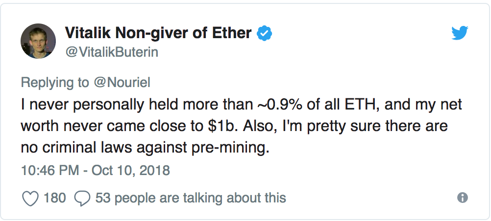 Buterin odhalil adresu peňaženky ako reakciu na post zo sociálnej siete. Na Twitteri profesor Nouriel Roubin z New York University tvrdil, že Vitalik je miliardár vďaka tomu, že si ponechal mnoho tokenov ešte predtým, než boli dostupné verejnosti, alebo si mince predťažil.