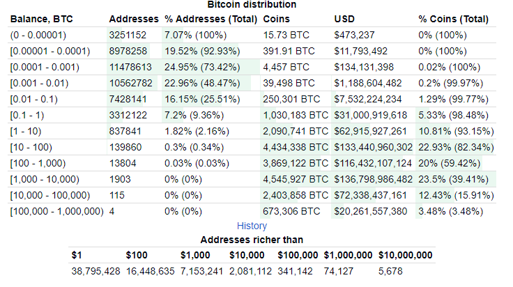 Bitcoin: rozdelenie majetku. Zdroj: BitInfoCharts