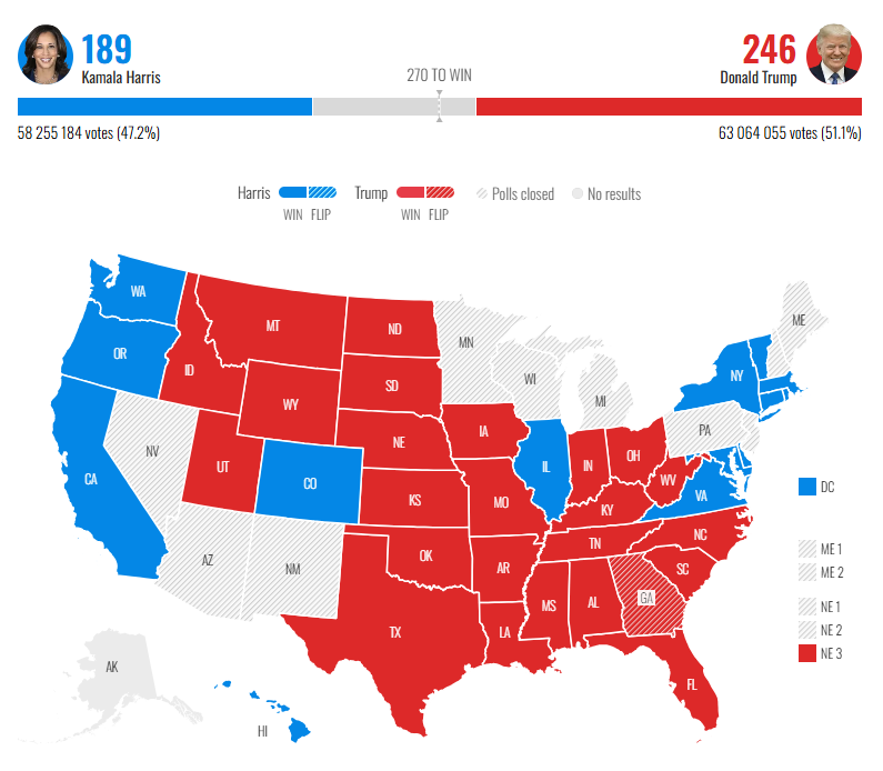 Americké prezidentské voľby ešte nemajú oficiálneho víťaza a v čase písania ešte nie sú spočítané všetky hlasy, no s vysokou pravdepodobnosťou zrejme vyhrá Donald Trump. Podľa predpovede Polymarket existuje šanca až 96,6 %, že bývalý prezident opäť získa prezidentské kreslo v USA. Na tieto udalosti Bitcoin reagoval prekonaním 75 000 dolárov.