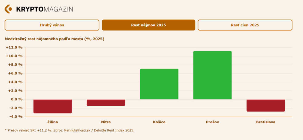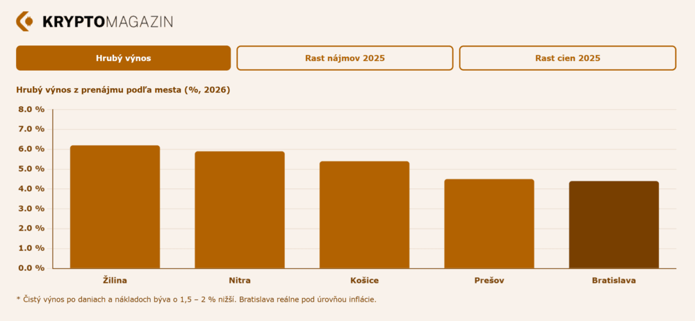 Ceny nehnuteľností na Slovensku vzrástli v roku 2025 o 12 %. Nájomné tiež rastie — ale nie všade rovnako. A práve v tomto rozdiele sa skrýva skutočná príležitosť pre investorov, ktorí vedia, kde hľadať. Ak uvažujete o kúpe bytu na prenájom, jedno rozhodnutie ovplyvní váš výnos viac než čokoľvek iné: výber mesta. Rozdiel medzi Bratislavou a Nitrou môže byť v hrubom ročnom výnose z prenájmu až 2 percentuálne body — čo pri investícii 150 000 € predstavuje tisíce eur ročne navyše.