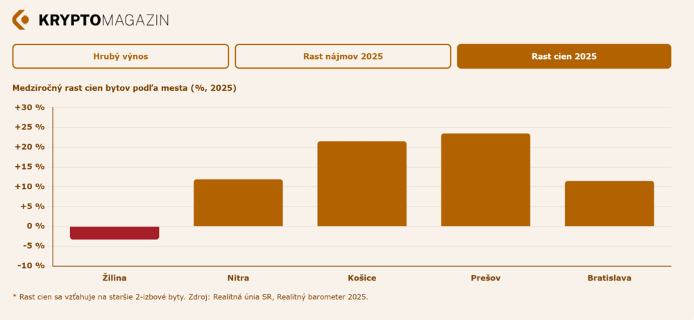 Práve tu je skrytý háčik. Žilina rástla v roku 2024 o rekordných +28,6 % pri starších 2-izbových bytoch — a po takom skoku nasledovala v roku 2025 prirodzená korekcia. Analytici upozorňujú, že nájomné tempo rastu cien nedrží a výnos môže v nasledujúcich rokoch ďalej klesať. Na papieri je Žilina líder, v praxi treba čísla sledovať pozorne.