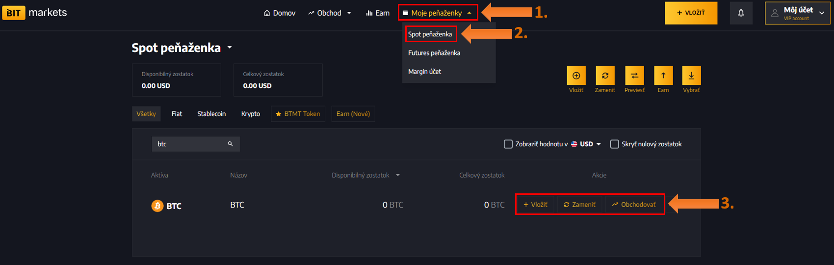 Svoj Bitcoin následne uvidíte v peňaženke, do ktorej sa dostanete cez hlavné menu ako vidíte na obrázku nižšie. V tejto sekcii taktiež môžete priamo Bitcoin vymieňať, vložiť ho, obchodovať alebo vybrať.
