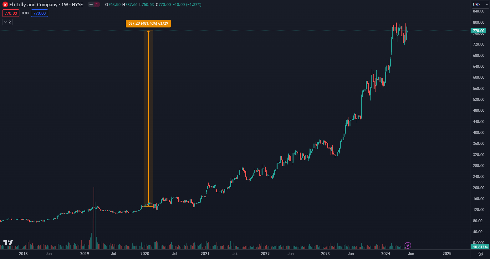Už dnes je Eli Lilly najväčšia farmaceutická spoločnosť na svete s trhovou kapitalizáciou 731 miliárd dolárov. Zároveň je to 10. najväčšia firma na svete. Len pre porovnanie, začiatkom roka 2020 bola kapitalizácia na úrovni len 125 miliárd dolárov. Takže len za 4 roky sa hodnota firmy zvýšila takmer 6-krát.