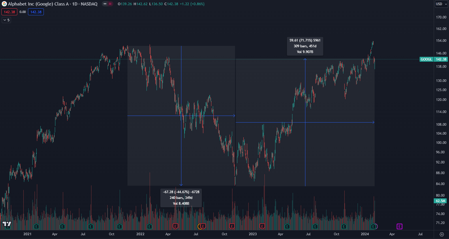 Akcie GOOGL majú takmer identický vývoj ako najväčšie akciové indexy Nasdaq a S&P 500. V roku 2022 vytvorili korekciu 44 %, no v roku 2023 bol celý tento pád vymazaný. Nedávno dokonca akcie prekonali najvyššiu historickú hodnotu 153 dolárov. Rast bol podporený silnými ziskovými maržami a odmenami pre akcionárov.