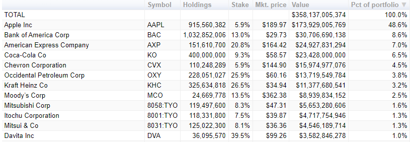 Napriek tomu, že 5-ročná investícia do spoločnosti Paytm sa Buffettovi nevydarila, jeho celkové portfólio v Berkshire Hathaway sa od roku 2018 zvýšilo o 60 %. Dokázal tak prevýšiť aj zisk najväčšieho amerického indexu S&P 500, ktorý za rovnaké obdobie stúpol o 49 %. Tabuľka nižšie zobrazuje najvyššie podiely s minimálnym zastúpením 1 % v portfóliu Buffetta v čase písania článku podľa CNBC.