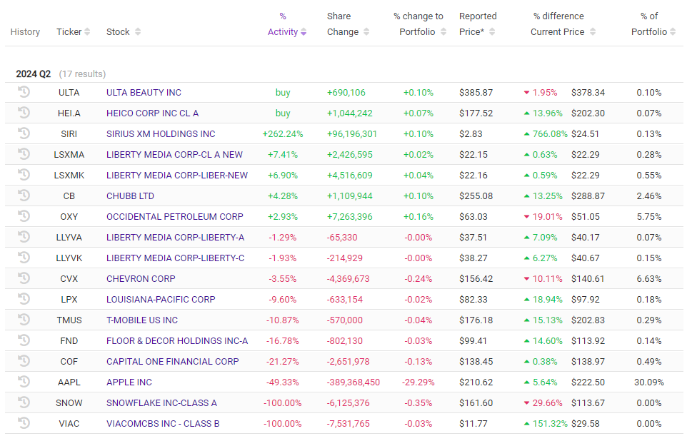 Detailnejší pohľad na investičné rozhodnutia Buffetta nám poskytnú údaje od Valuesider. Môžeme vidieť konsolidované zmeny v portfóliu za druhý kvartál 2024, kde jasne vidíme, že prevládali predaje. Buffett sa zbavil všetkých akcií Viacomcbs Inc a Snowflake Inc, no zrejme najzaujímavejším pohybom je predaj až 49,33 % akcií Apple, o čom sme vás informovali už koncom augusta.
