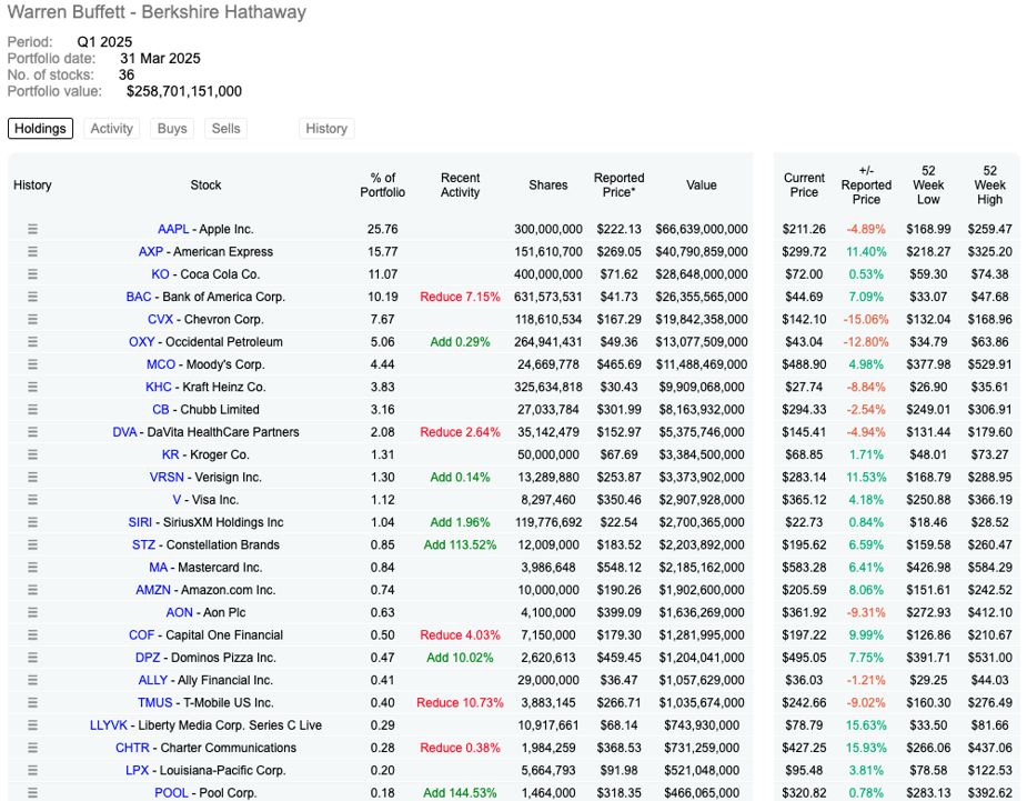 Hoci v uplynulom štvrťroku do portfólia nepribudli žiadne nové akcie, Berkshire mierne zvýšila svoje podiely v niekoľkých existujúcich spoločnostiach. Najvýraznejšou je spoločnosť Occidental Petroleum, ktorá už bola jednou z najväčších zložiek portfólia a teraz tvorí viac ako 5 % jeho hodnoty. Buffett v minulosti opakovane vyjadril dôveru v riadenie tejto ropnej spoločnosti a jej dlhodobý potenciál.